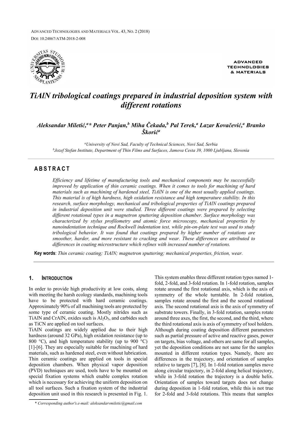 Efficiency and lifetime of manufacturing tools and mechanical components may be successfully improved by application of thin ceramic coatings. When it comes to tools for machining of hard materials such as machining of hardened steel, TiAlN is one of the most usually applied coatings. This material is of high hardness, high oxidation resistance and high temperature stability. In this research, surface morphology, mechanical and tribological properties of TiAlN coatings prepared in industrial deposition unit were studied. Three different coatings were prepared by selecting different rotational types in a magnetron sputtering deposition chamber. Surface morphology was characterized by stylus profilometry and atomic force microscopy, mechanical properties by nanoindentation technique and Rockwell indentation test, while pin-on-plate test was used to study tribological behavior. It was found that coatings prepared by higher number of rotations are smoother, harder, and more resistant to cracking and wear. These differences are attributed to differences in coating microstructure which refines with increased number of rotations.