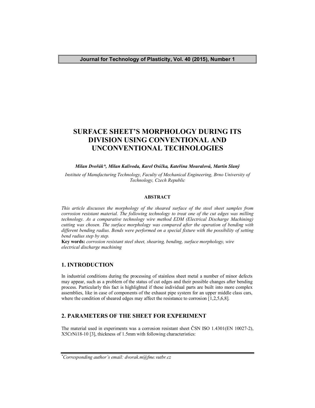 This article discusses the morphology of the sheared surface of the steel sheet samples from corrosion resistant material. The following technology to treat one of the cut edges was milling technology. As a comparative technology wire method EDM (Electrical Discharge Machining) cutting was chosen. The surface morphology was compared after the operation of bending with different bending radius. Bends were performed on a special fixture with the possibility of setting bend radius step by step.
