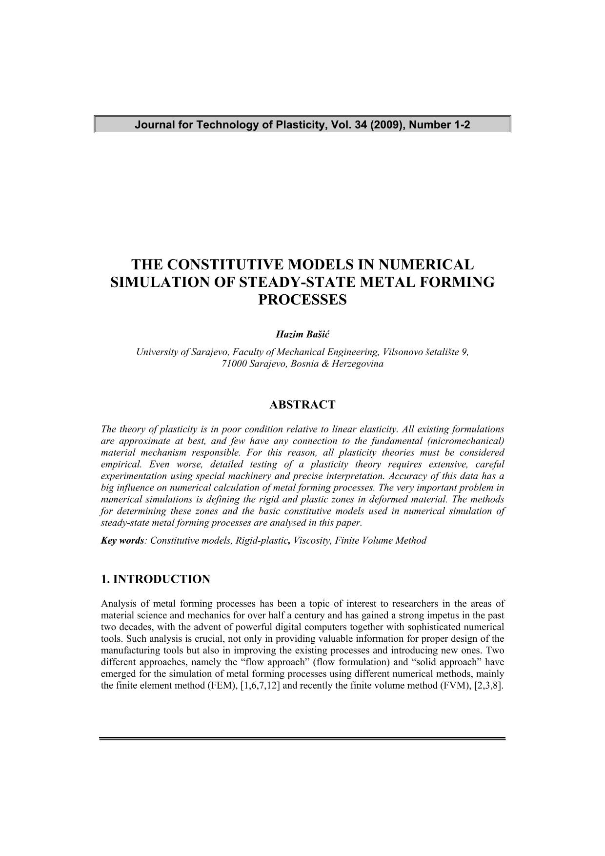 The theory of plasticity is in poor condition relative to linear elasticity. All existing formulations are approximate at best, and few have any connection to the fundamental (micromechanical) material mechanism responsible. For this reason, all plasticity theories must be considered empirical. Even worse, detailed testing of a plasticity theory requires extensive, careful experimentation using special machinery and precise interpretation. Accuracy of this data has a big influence on numerical calculation of metal forming processes. The very important problem in numerical simulations is defining the rigid and plastic zones in deformed material. The methods for determining these zones and the basic constitutive models used in numerical simulation of steady-state metal forming processes are analysed in this paper.