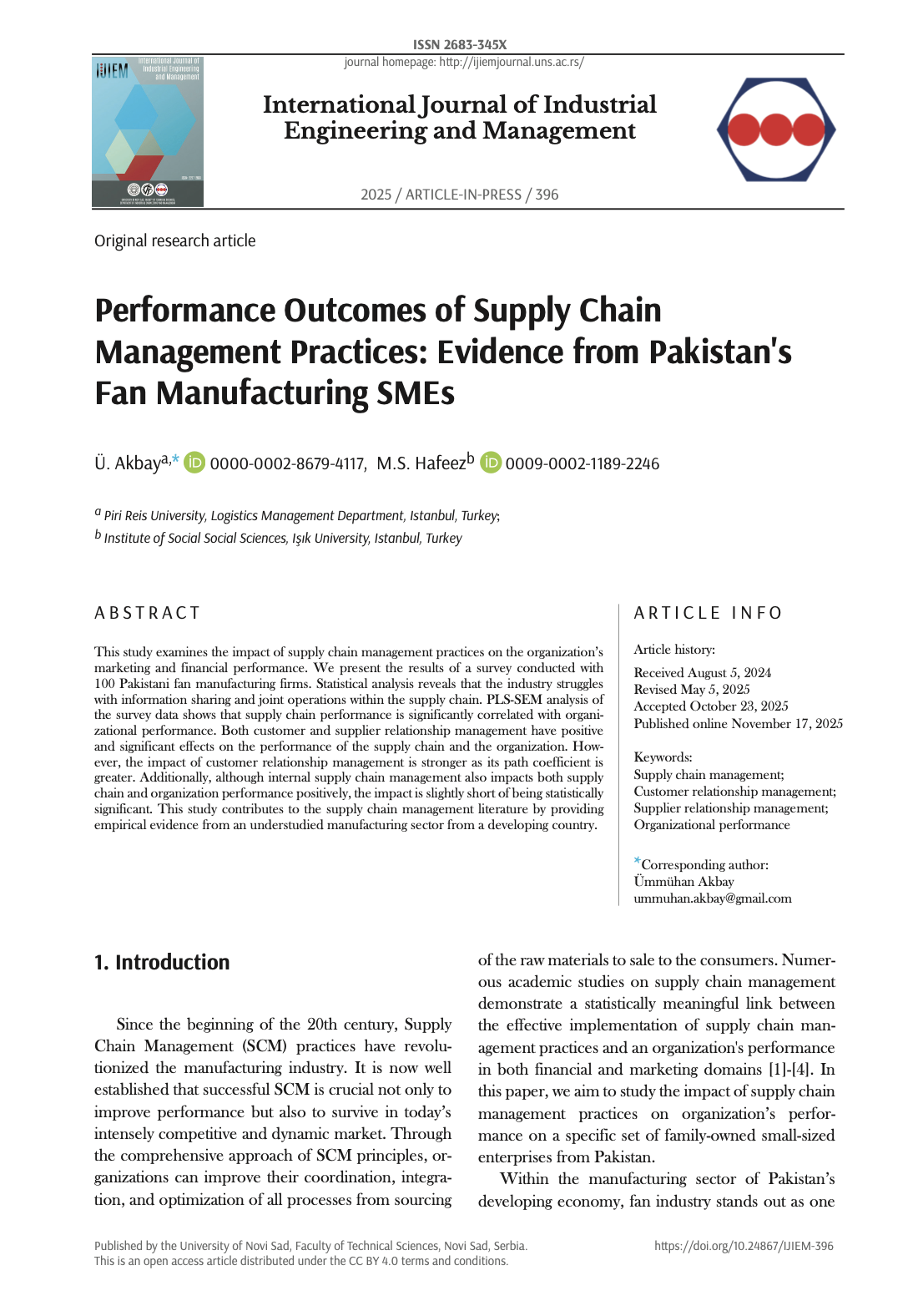 Performance Outcomes of Supply Chain Management Practices: Evidence from Pakistan's Fan Manufacturing SMEs