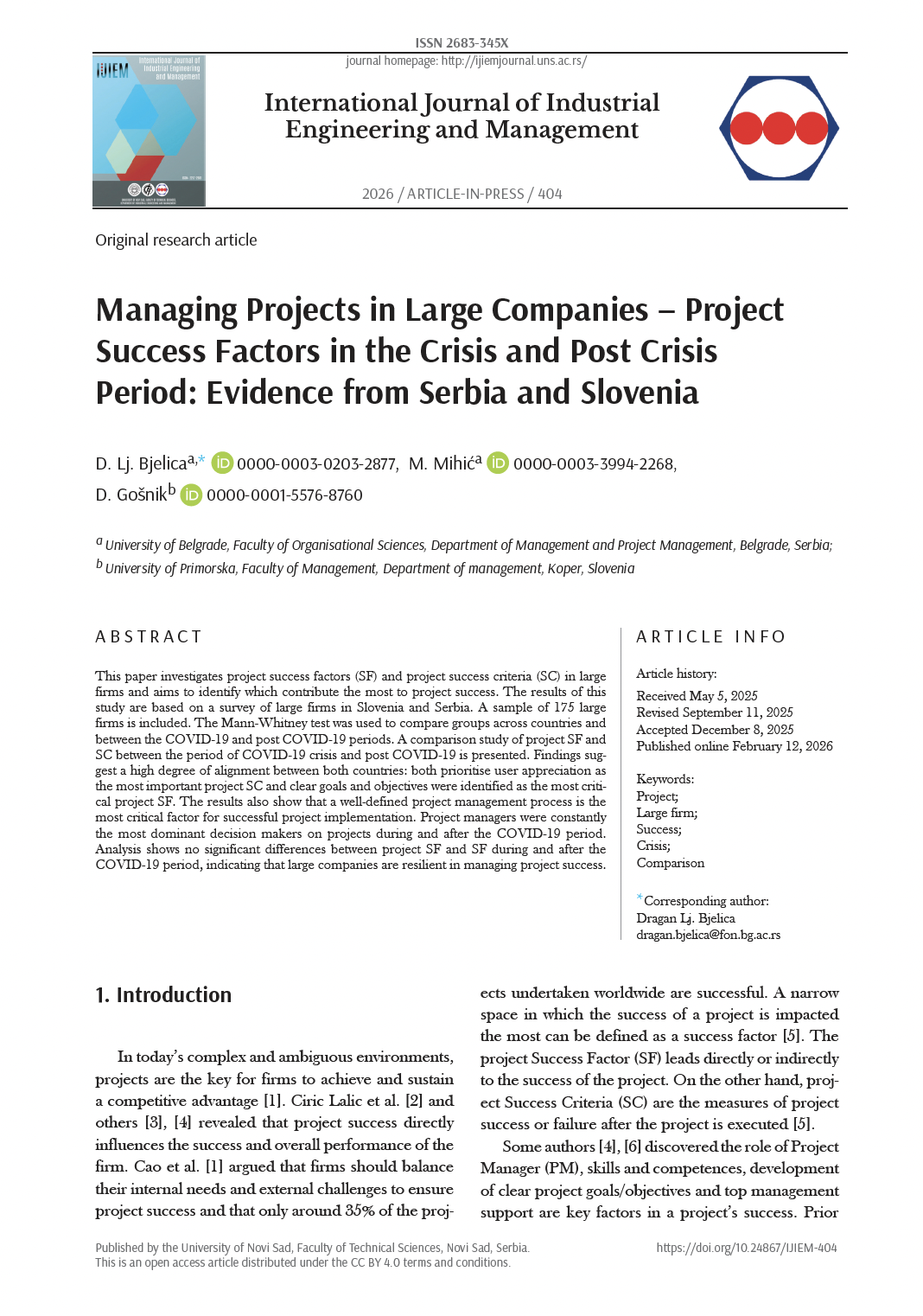 Managing Projects in Large Companies – Project Success Factors in the Crisis and Post Crisis Period: Evidence from Serbia and Slovenia