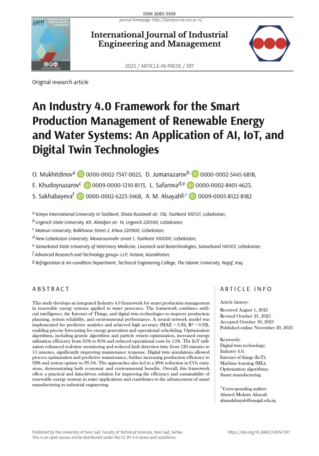 This study develops an integrated Industry 4.0 framework for smart production management in renewable energy systems applied to water processes. The framework combines artificial intelligence, the Internet of Things, and digital twin technologies to improve production planning, system reliability, and environmental performance. A neural network model was implemented for predictive analytics and achieved high accuracy (MAE = 0.82, R² = 0.92), enabling precise forecasting for energy generation and operational scheduling. Optimization algorithms, including genetic algorithms and particle swarm optimization, increased energy utilization efficiency from 65% to 85% and reduced operational costs by 15%. The IoT utilization enhanced real-time monitoring and reduced fault detection time from 120 minutes to 15 minutes, significantly improving maintenance response. Digital twin simulations allowed process optimization and predictive maintenance, further increasing production efficiency to 92% and system uptime to 99.5%. The approaches also led to a 20% reduction in CO₂ emissions, demonstrating both economic and environmental benefits. Overall, this framework offers a practical and data-driven solution for improving the efficiency and sustainability of renewable energy systems in water applications and contributes to the advancement of smart manufacturing in industrial engineering.