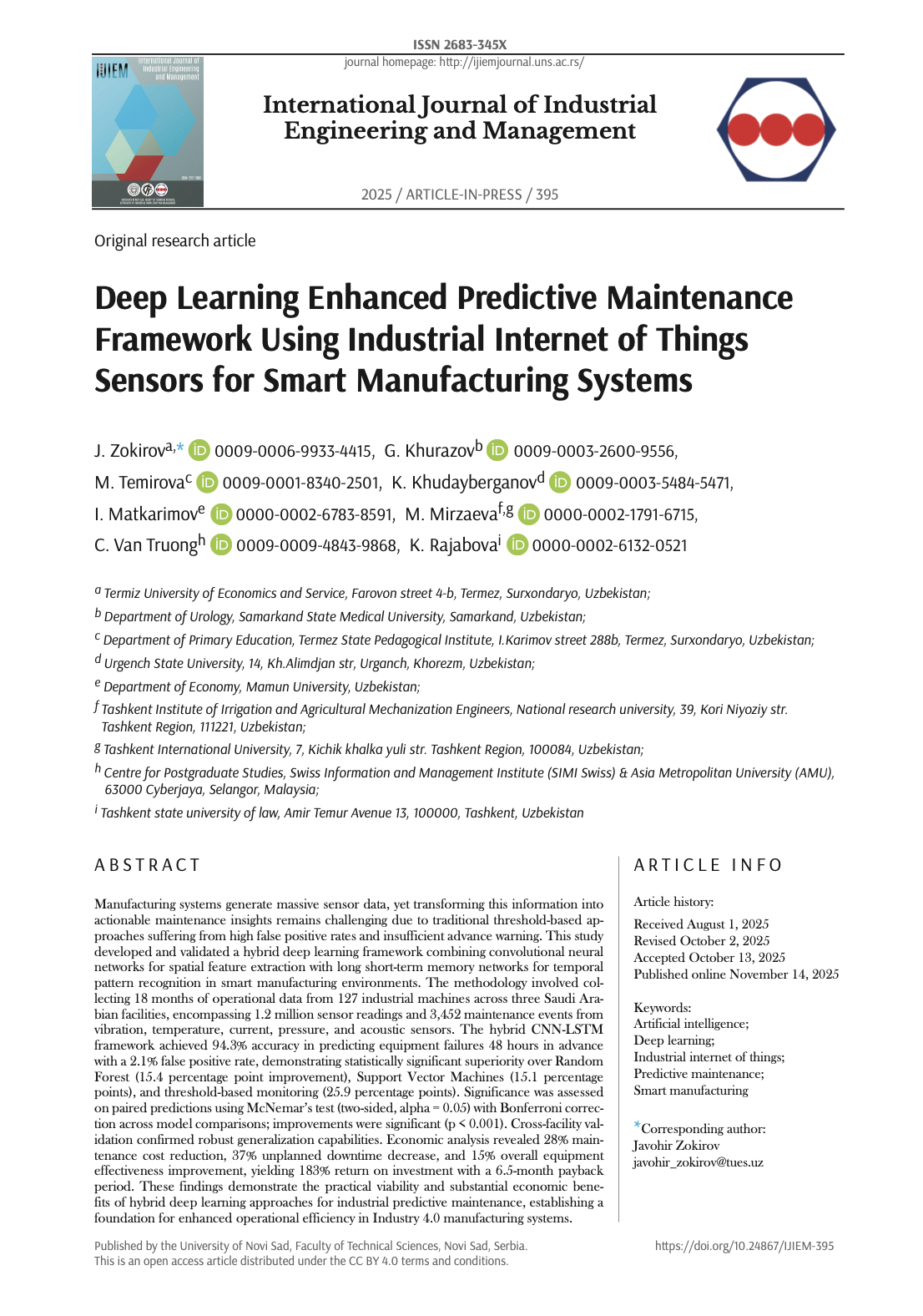Manufacturing systems generate massive sensor data, yet transforming this information into actionable maintenance insights remains challenging due to traditional threshold-based approaches suffering from high false positive rates and insufficient advance warning. This study developed and validated a hybrid deep learning framework combining convolutional neural networks for spatial feature extraction with long short-term memory networks for temporal pattern recognition in smart manufacturing environments. The methodology involved collecting 18 months of operational data from 127 industrial machines across three Saudi Arabian facilities, encompassing 1.2 million sensor readings and 3,452 maintenance events from vibration, temperature, current, pressure, and acoustic sensors. The hybrid CNN-LSTM framework achieved 94.3% accuracy in predicting equipment failures 48 hours in advance with a 2.1% false positive rate, demonstrating statistically significant superiority over Random Forest (15.4 percentage point improvement), Support Vector Machines (15.1 percentage points), and threshold-based monitoring (25.9 percentage points). Significance was assessed on paired predictions using McNemar’s test (two-sided, alpha = 0.05) with Bonferroni correction across model comparisons; improvements were significant (p < 0.001). Cross-facility validation confirmed robust generalization capabilities.